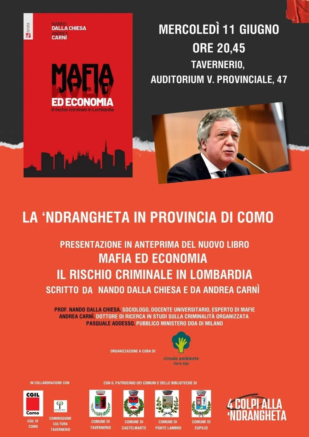 Presentazione del nuovo libro Mafia ed economia – Il rischio criminale in Lombardia mercoledì 11 giugno alle ore 20,45 nell’auditorium di Tavernerio in via Provinciale n. 47.